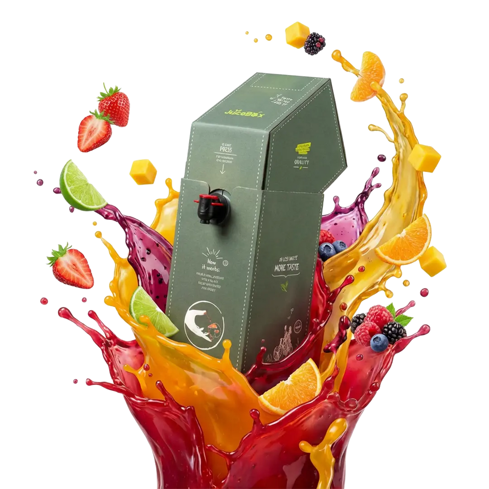 The JuiceBox™ Light is a 2-Liter box filled with delicious liquid drink concentrate that you can tap yourself and it has just 3.5 calories per 100 ml (served drink)! It contains zero added sugar, making it the perfect choice for conscious enjoyment. Imagine a large concentrate dispenser that is eco-friendly because it eliminates single-use plastic bottles. It’s super easy: Open the lid, press the tap, and your favorite light drink flows right into your glass, just add water and enjoy!.